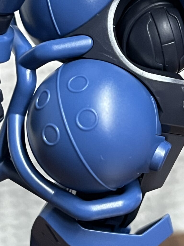 ジークアクスらしく丸みのあるデザインで太ももの推進剤タンクらしきものがかなり目立ちます。両肩のパトランプも軍警らしく特徴的です。