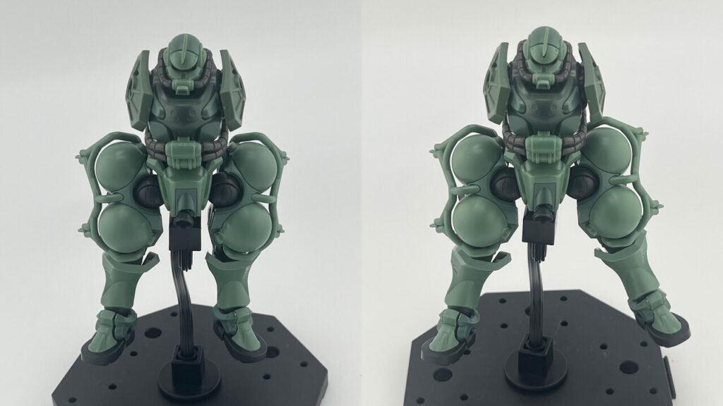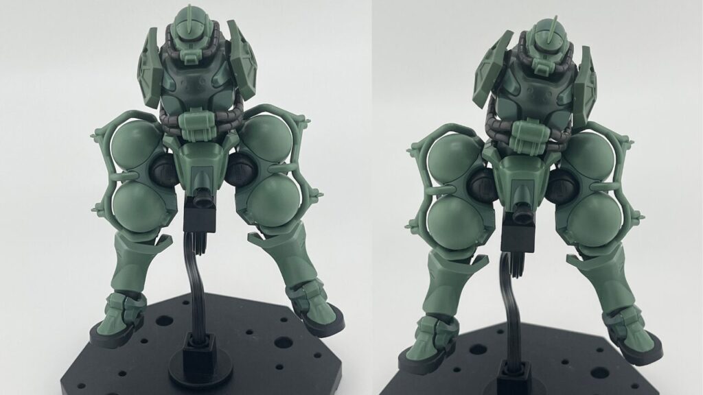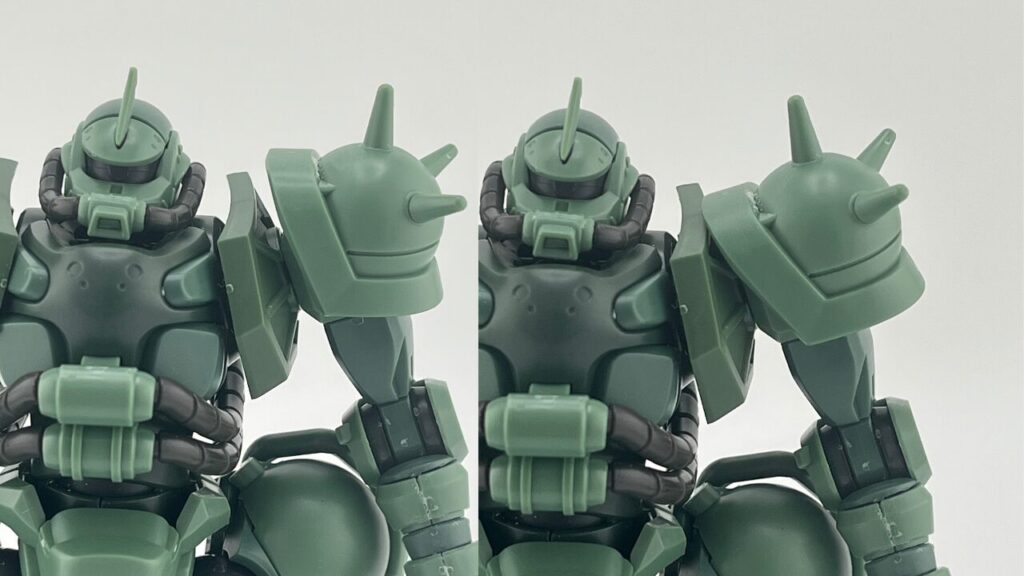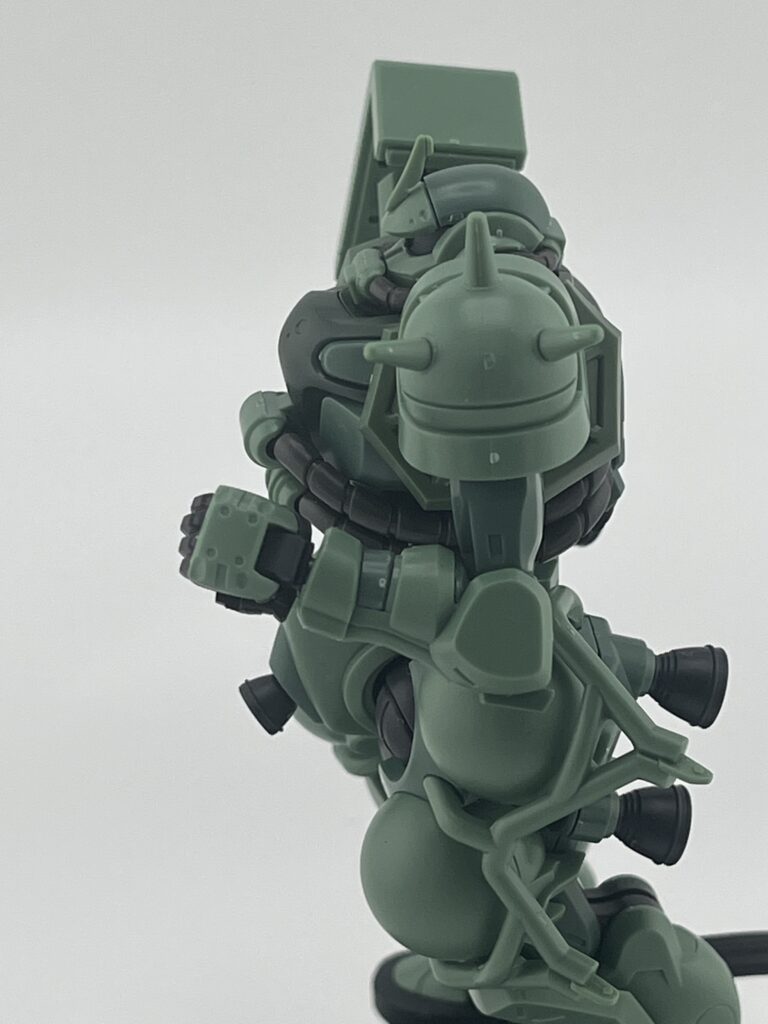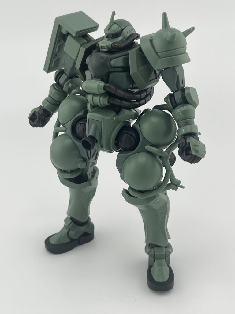 もう結構見慣れたGQザクです。以前発売された軍警ザクと比較すると、肩シールドとスパイクが変更され、太ももの推進剤のデティールが削られています。