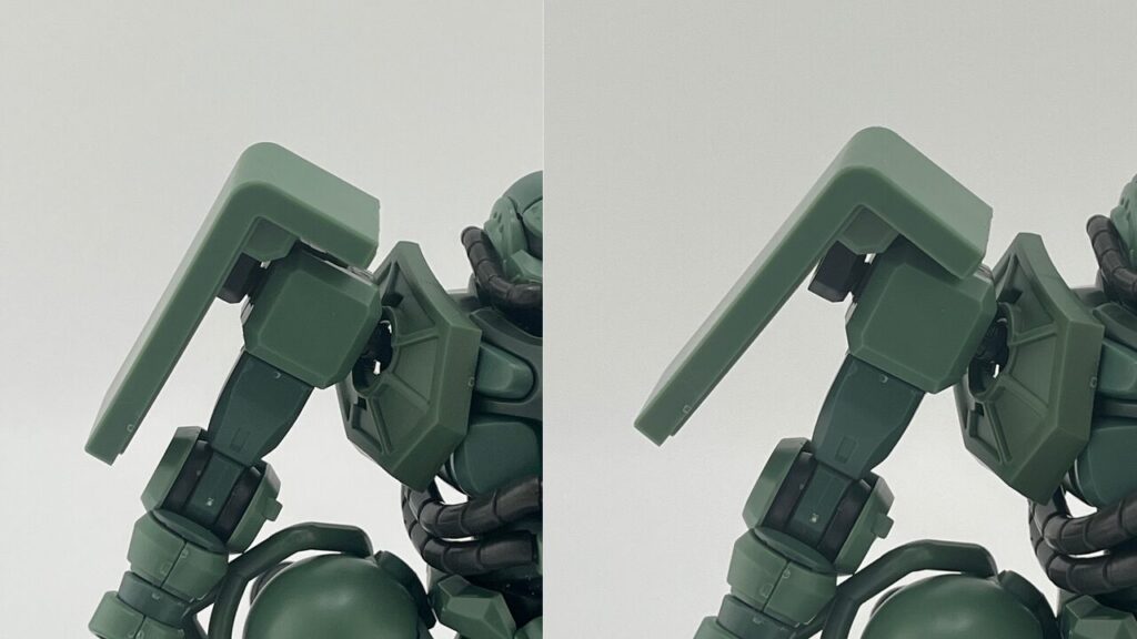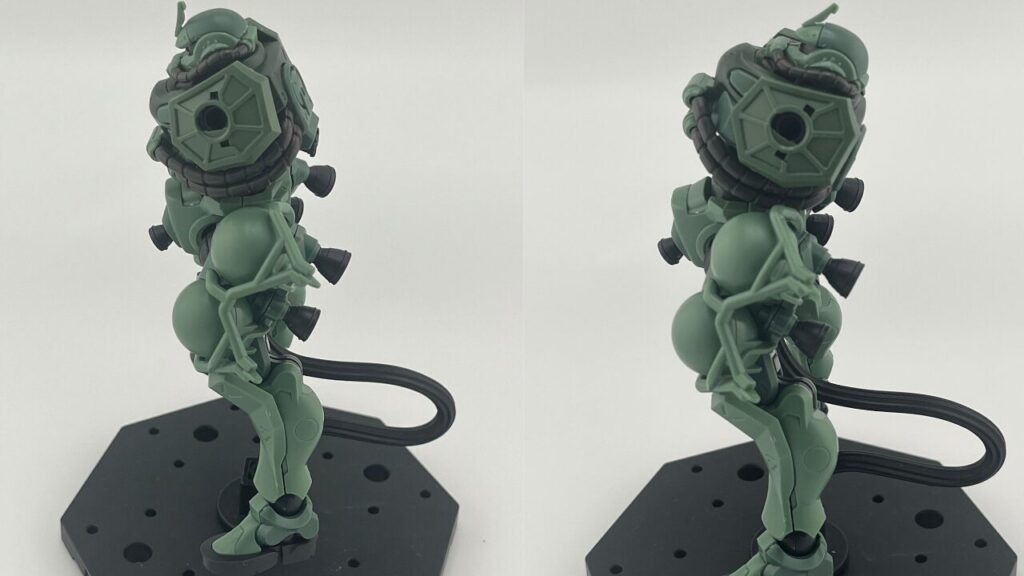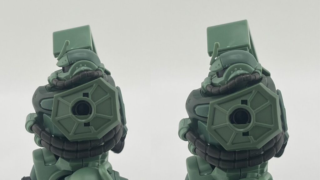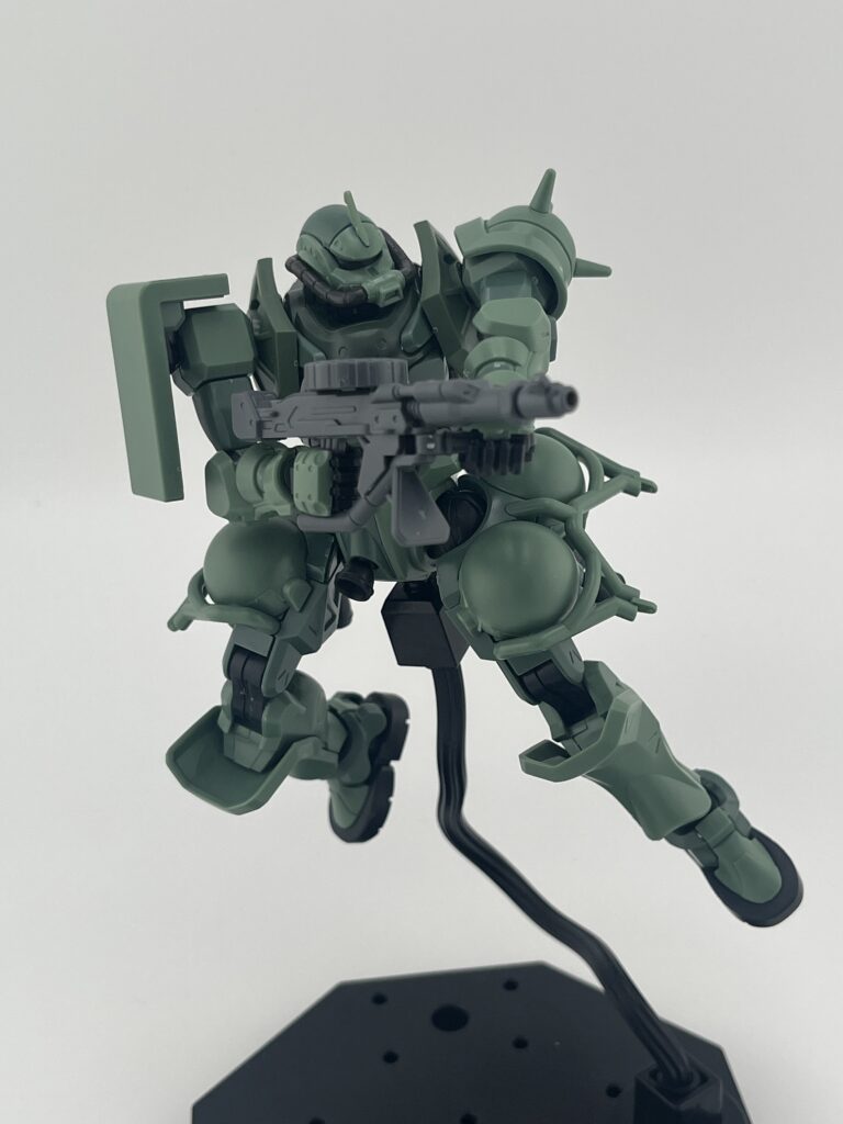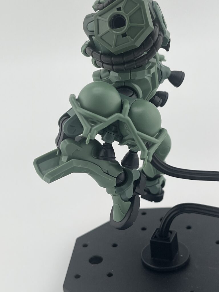 もう結構見慣れたGQザクです。以前発売された軍警ザクと比較すると、肩シールドとスパイクが変更され、太ももの推進剤のデティールが削られています。