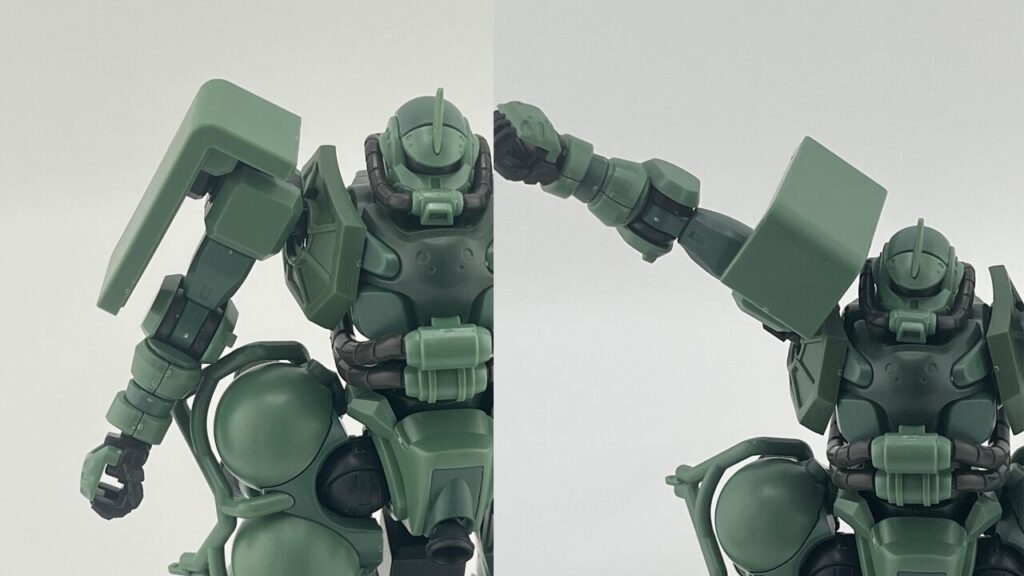 肩の前後への可動です。かなり前に出すことができ、マシンガンやバズーカを両手で持ちやすくなっています。