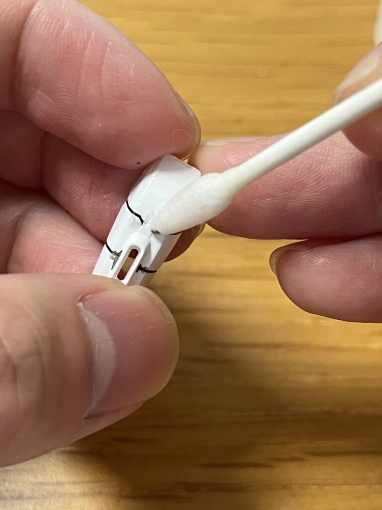 - エナメル溶剤を綿棒にごく少量含ませて、叩くように拭く → 強くこすると下地の塗膜まで溶けるので注意。
