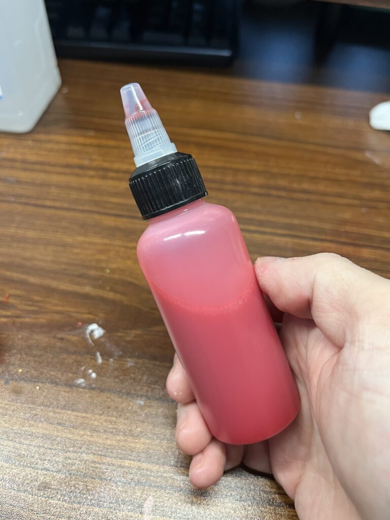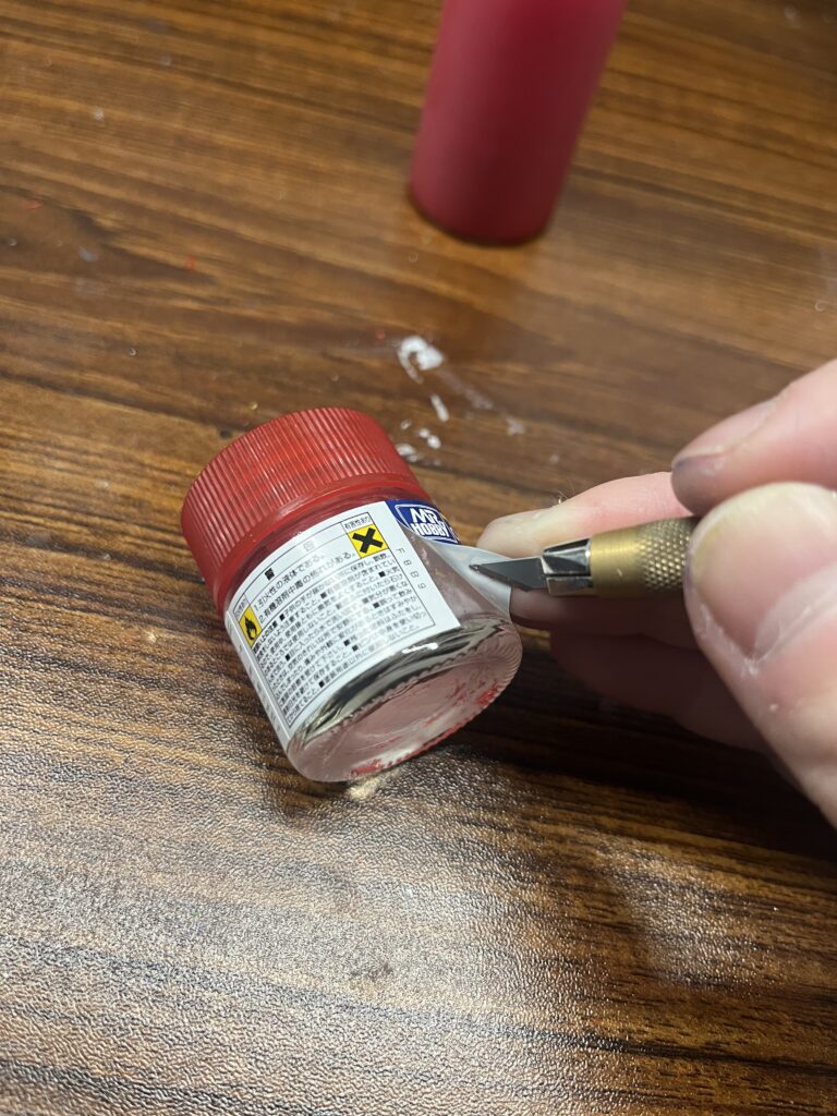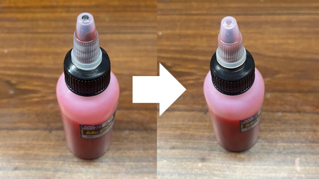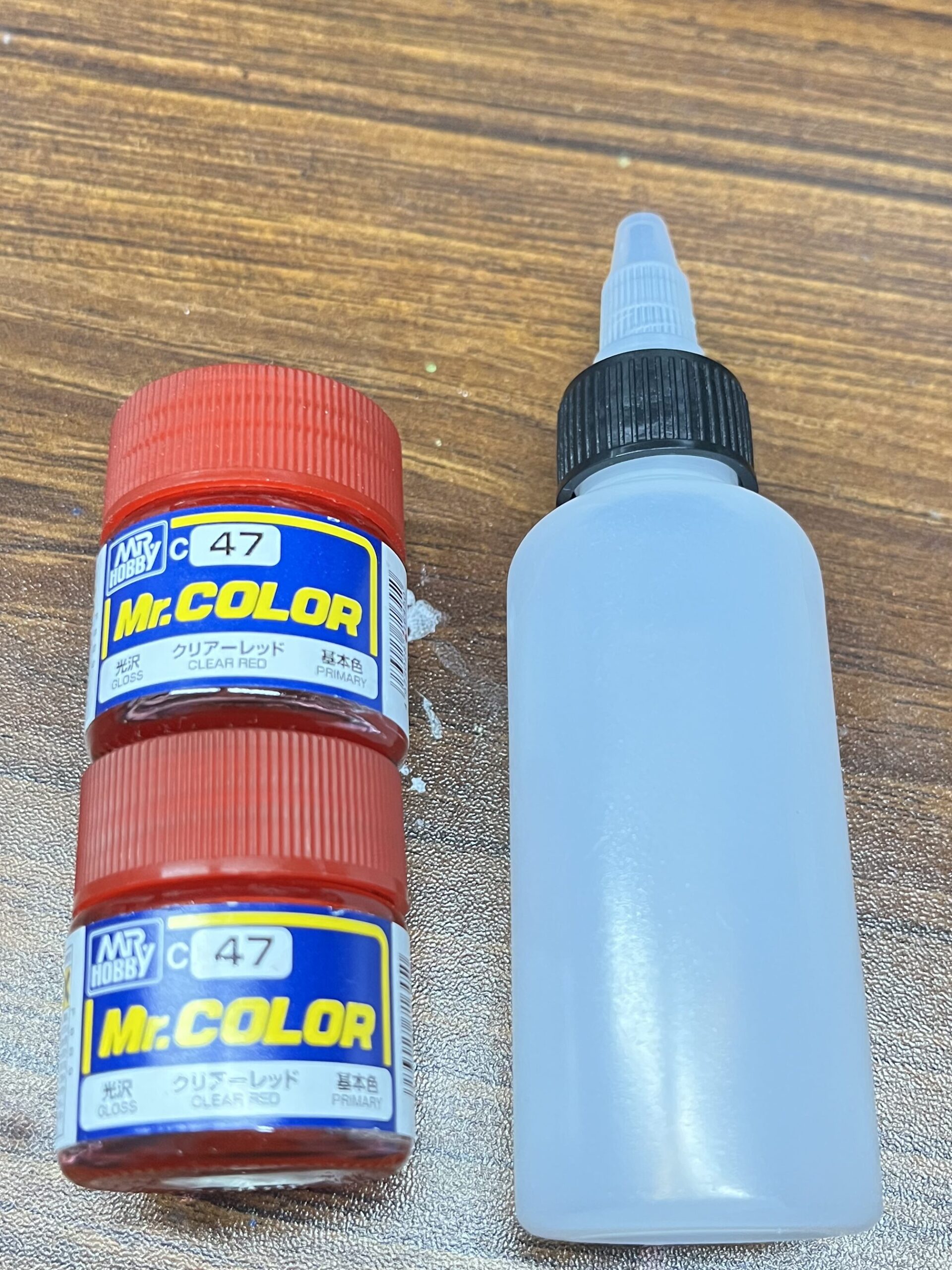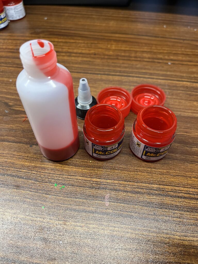 ボトルの上部分を外してクリアレッドを2本入れます。瓶にはまだ塗料が残っているのでここに希釈溶剤を入れてボトルに入れるを繰り返します。