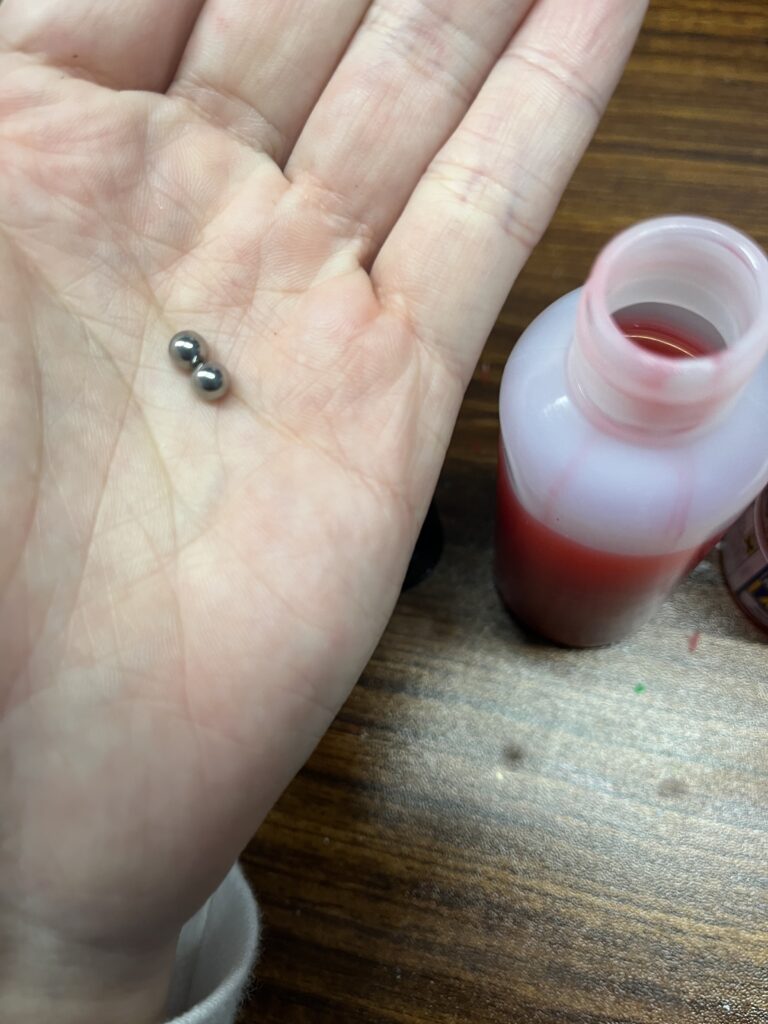攪拌用の鉄球を2個ほど入れておきます。これで振るだけできれいにかき混ぜることができるので攪拌棒の使用も省略することができます。