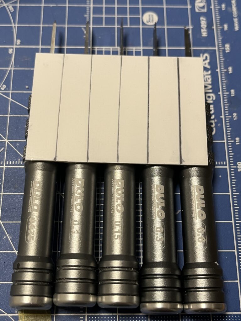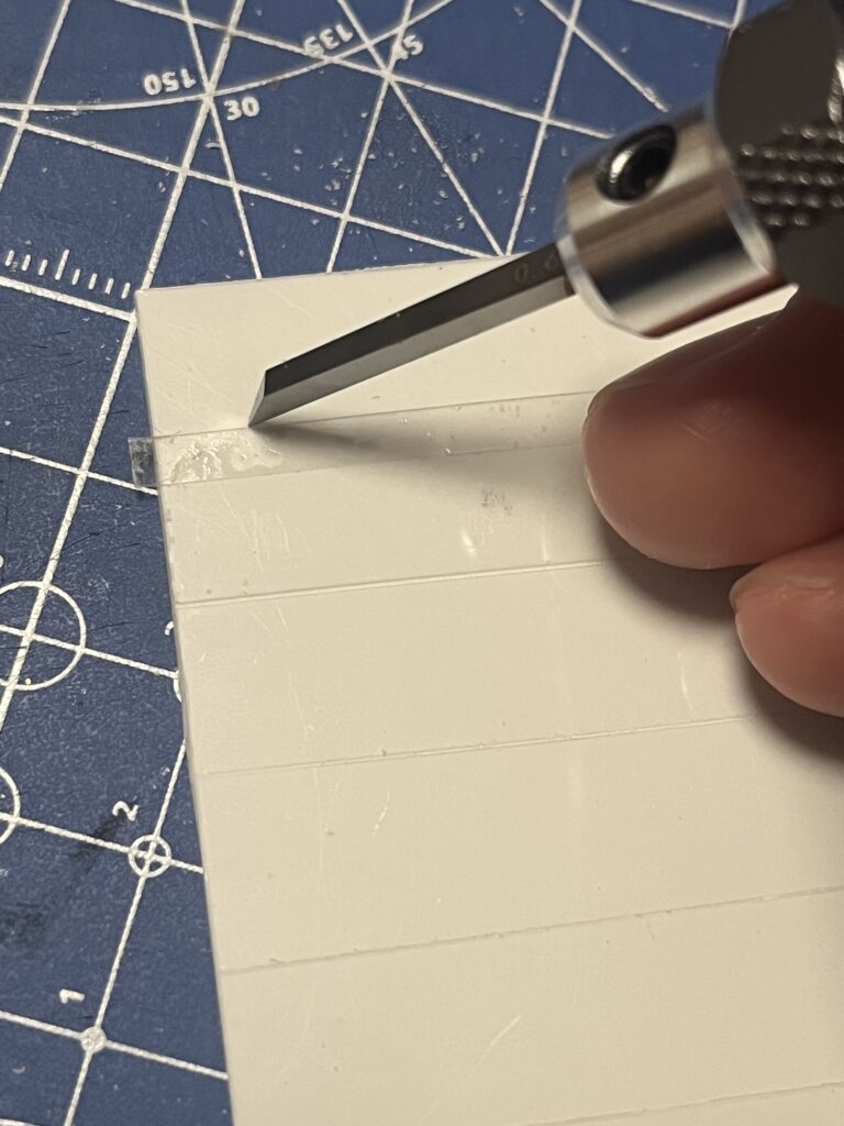プラ板に私の手持ちの5種類(0.075/0.1/0.15/0.3/0.6)でスジボリを掘っていきます。