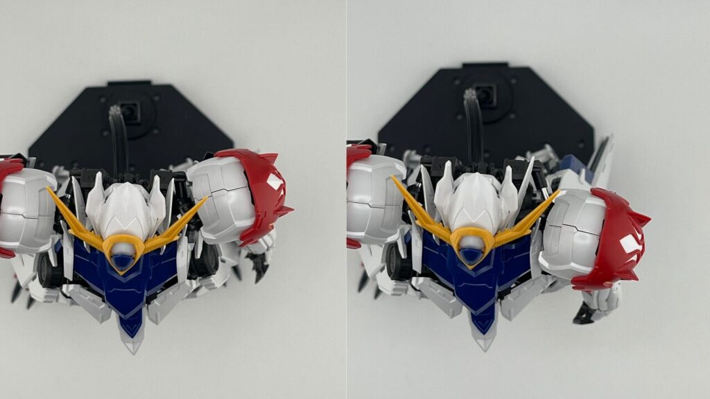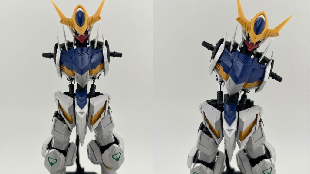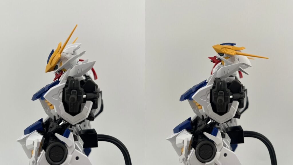 バルバトスの頭が前後に長いのもあって左右の首振りはサイドの襟に顎があたりあまり可動域としてはよくありません。