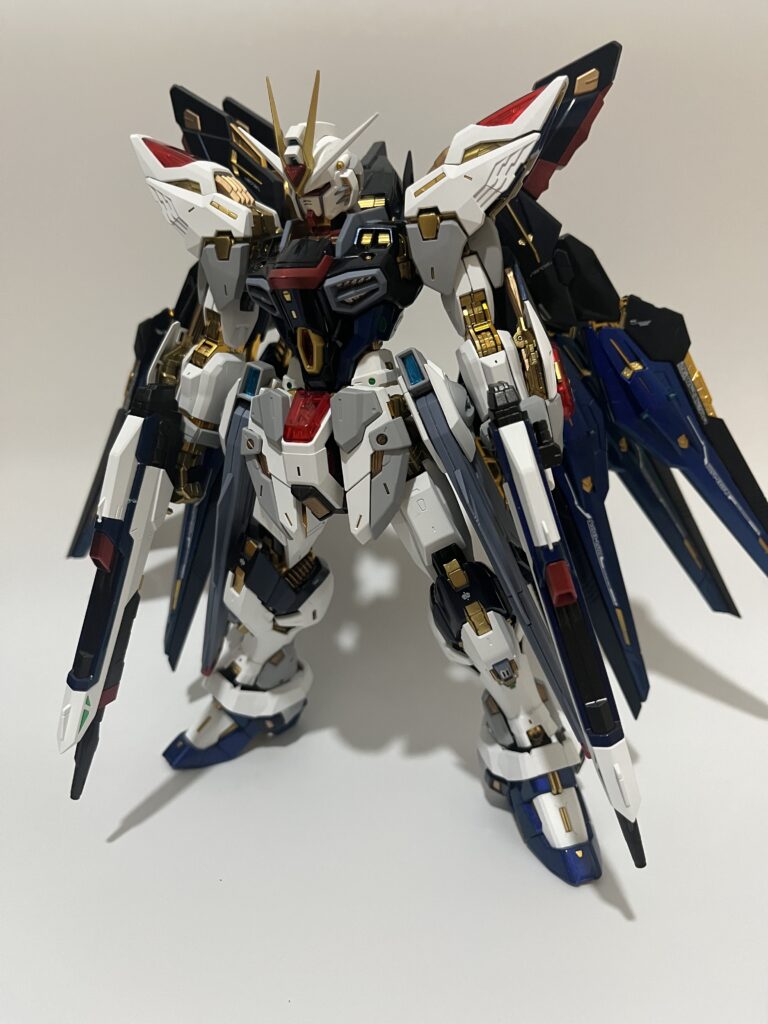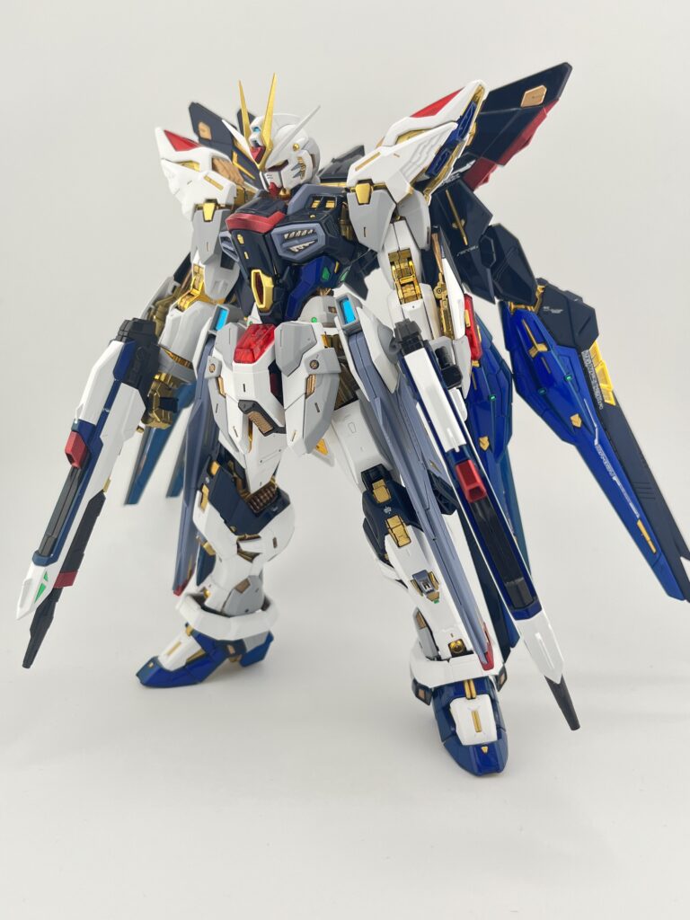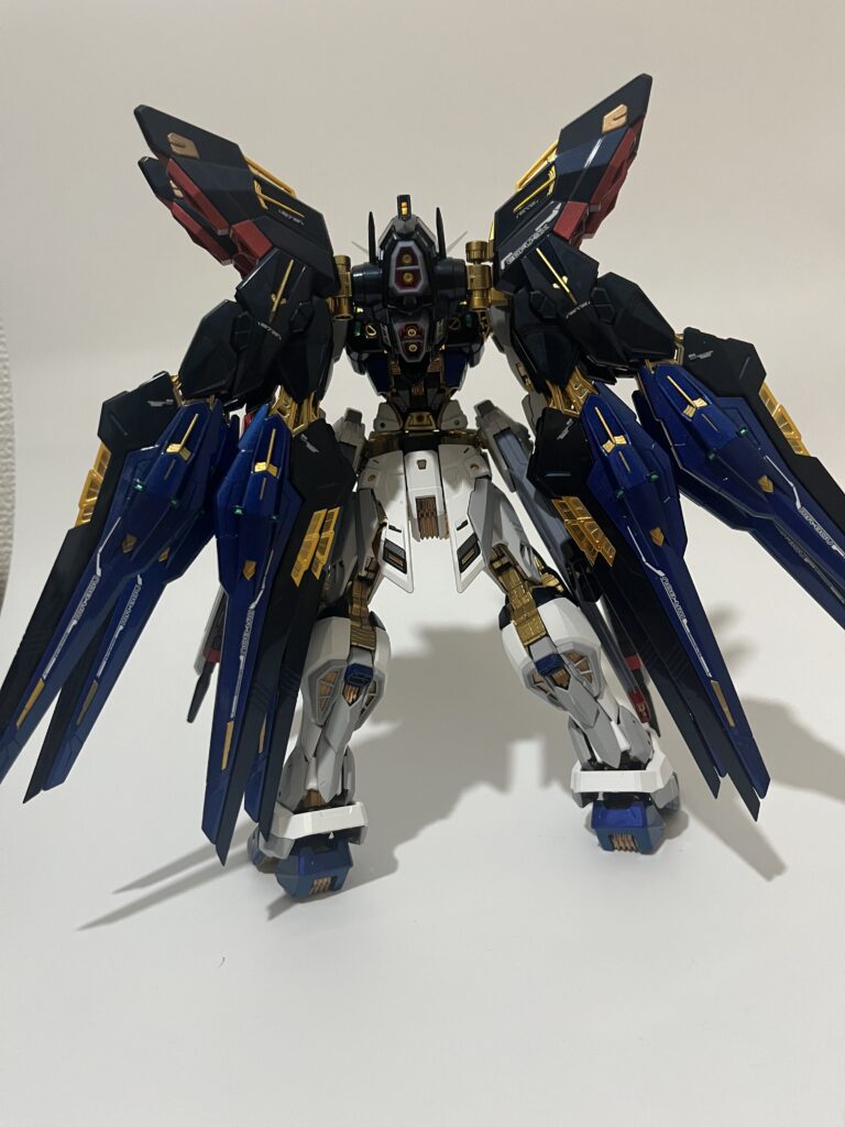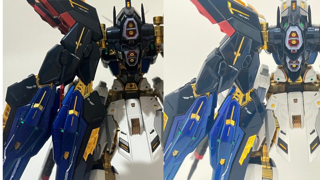 また、このガンプラは青い羽の部分と濃い紺色の部分は光沢塗装、内部フレームはメタリック塗装、その他は艶消しマット塗装してあるのですがうまく光沢感が伝わりません。